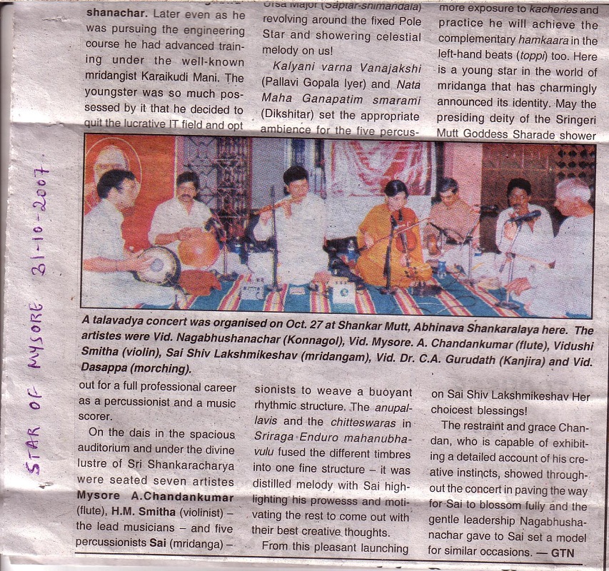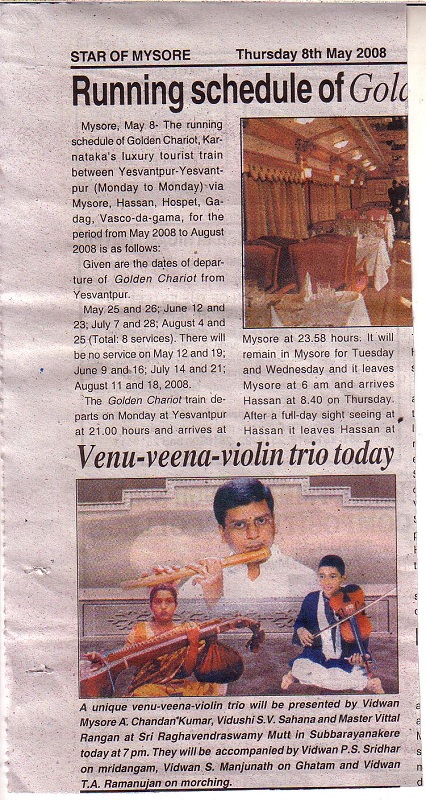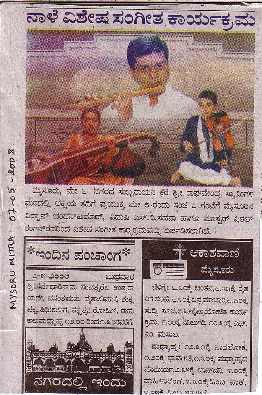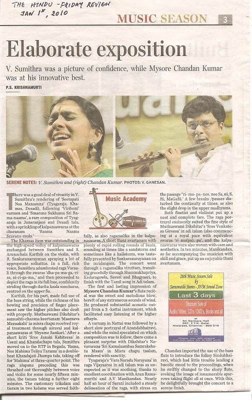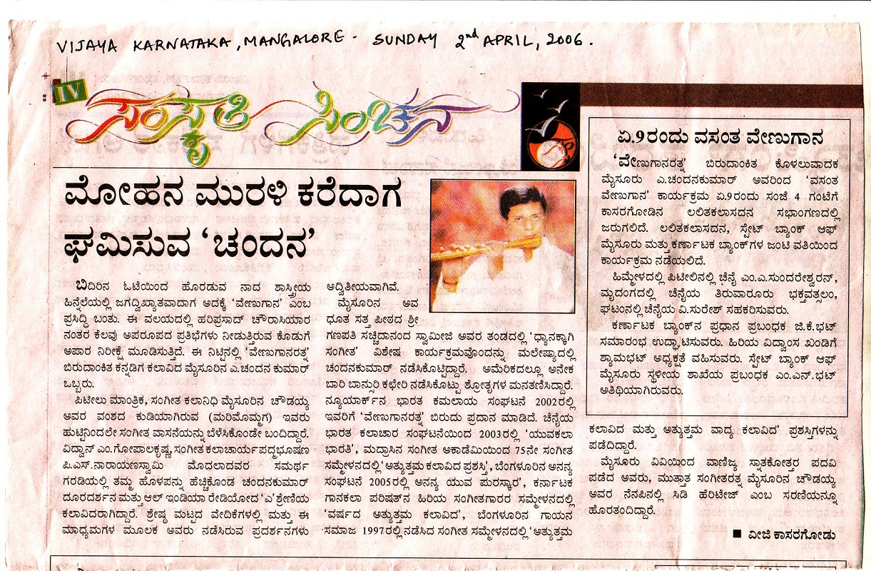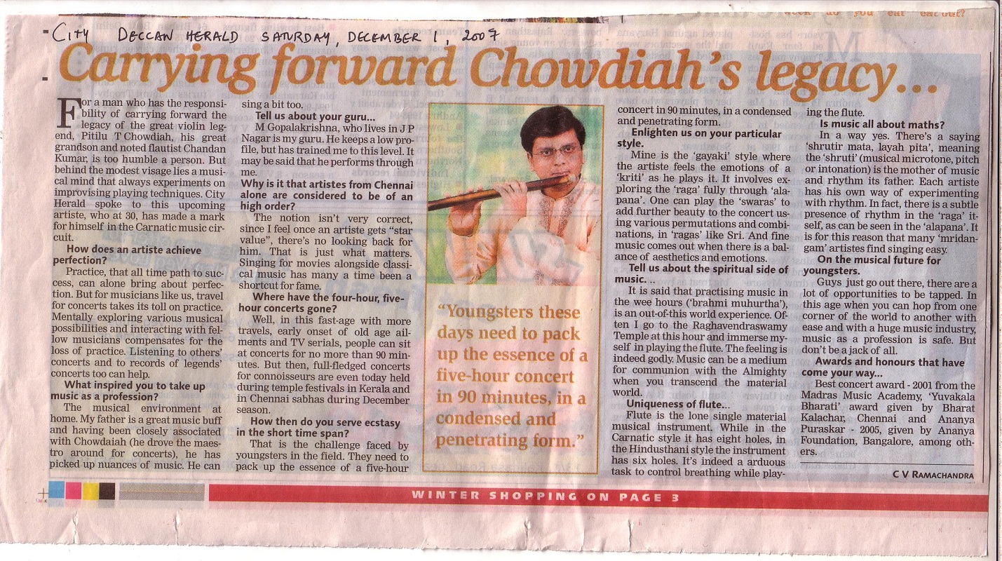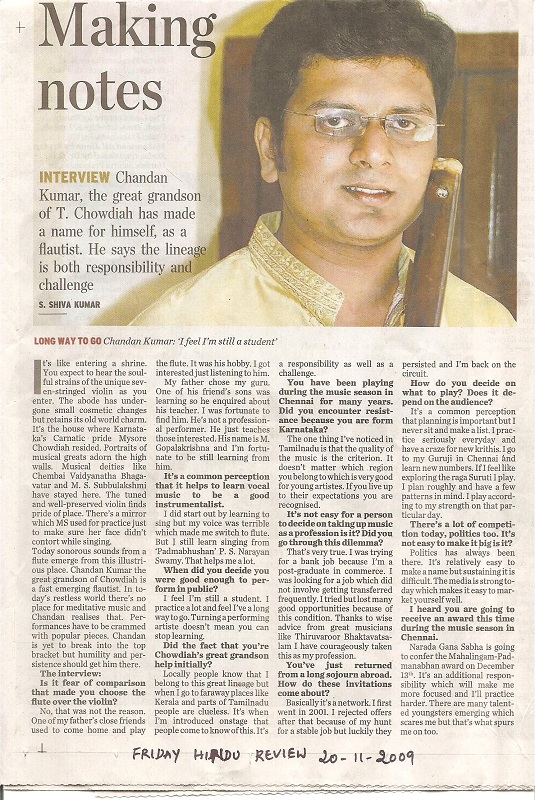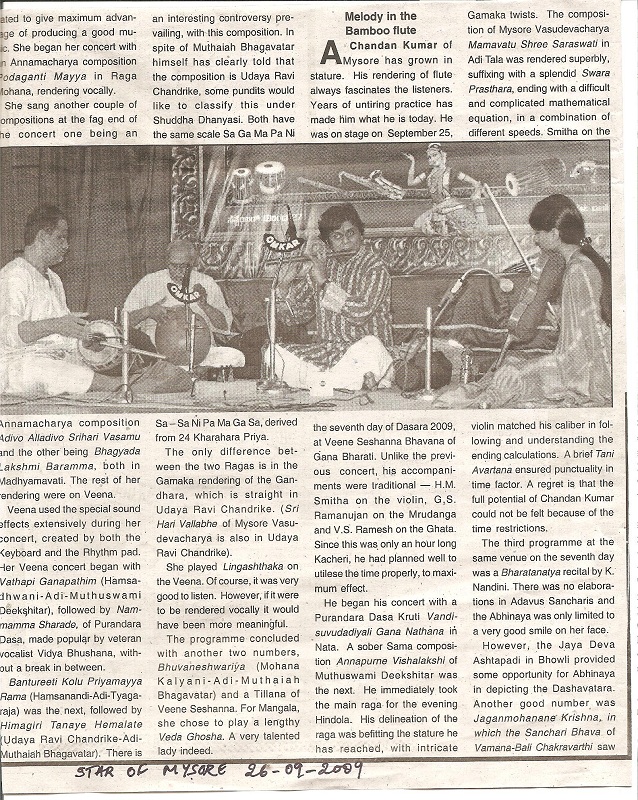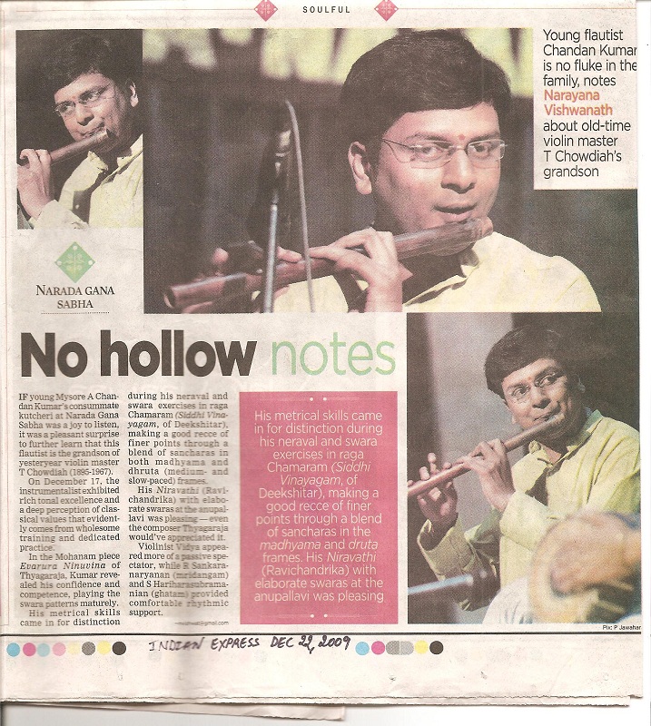The announcement of the award for the year 2009 has been made by the Academy and Mysore A. Chandan Kumar, flautist, is among the 32 awardees (8 for Music, 8 for Dance, 8 for Theatre and 8 for othere traditional/Folk/Tribal dance – music- theatre/puppetry).